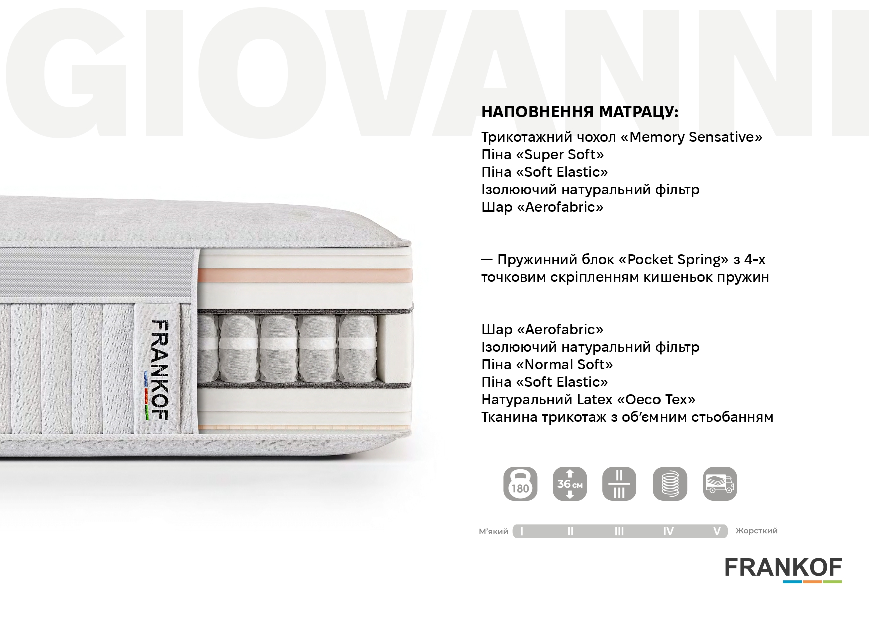 Матрац GIOVANNI — втілення найкращих інновацій для здорового сну на основі незалежного пружинного блоку. Зовнішній чохол виконаний зі суперкомфортного трикотажу «Memory Sensitive», що забезпечує делікатне облягання тіла та підлаштовується під ваші контури, створюючи ефект обіймів. Завдяки тканині із об’ємними стьобаннями, матрац виглядає стильно та надає відчуття розкоші.