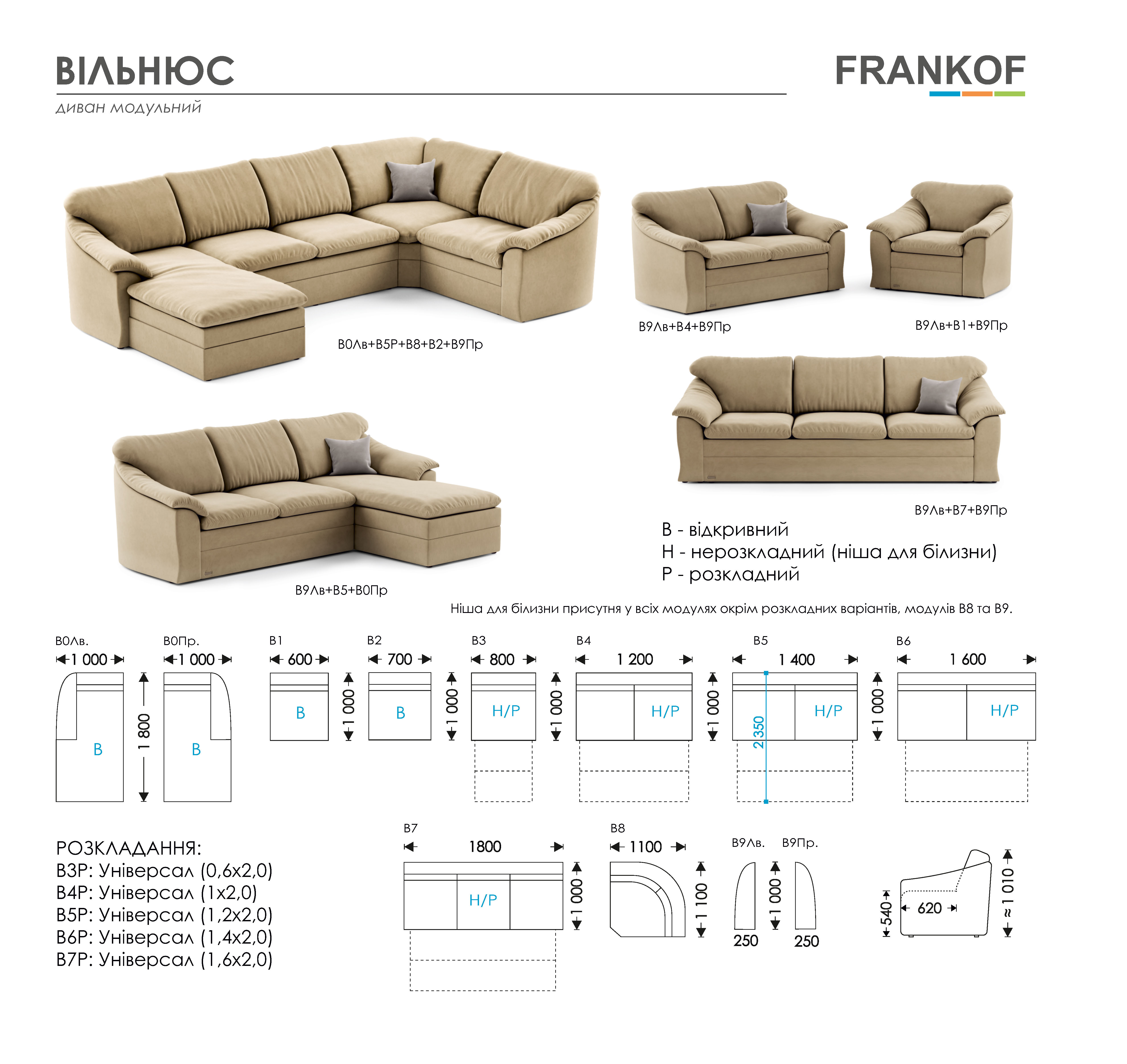 | Ніші для білизни | Присутні у всіх модулях, окрім розкладних варіантів, модулів В8 та В9 |